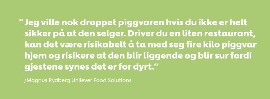 Har du byttet til frosne råvarer der du kan? Hvis ikke – prøv! I dag er kvaliteten god på frossen fisk og grønnsaker. Trenger du meierifløte eller kan du bytte til et billigere alternativ uten at gjestene rynker på nesen? Hent frem dine matlagingskunnskaper og prøv deg frem. Og husk – snarveier krever både kunnskap og evne til å vurdere resultatet.