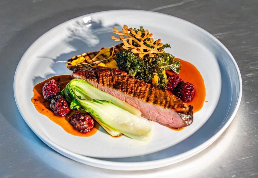 Andebryst med Hokkaido‑gresskarpuré med ingefær, sopp, tuile og bjørnebærsaus